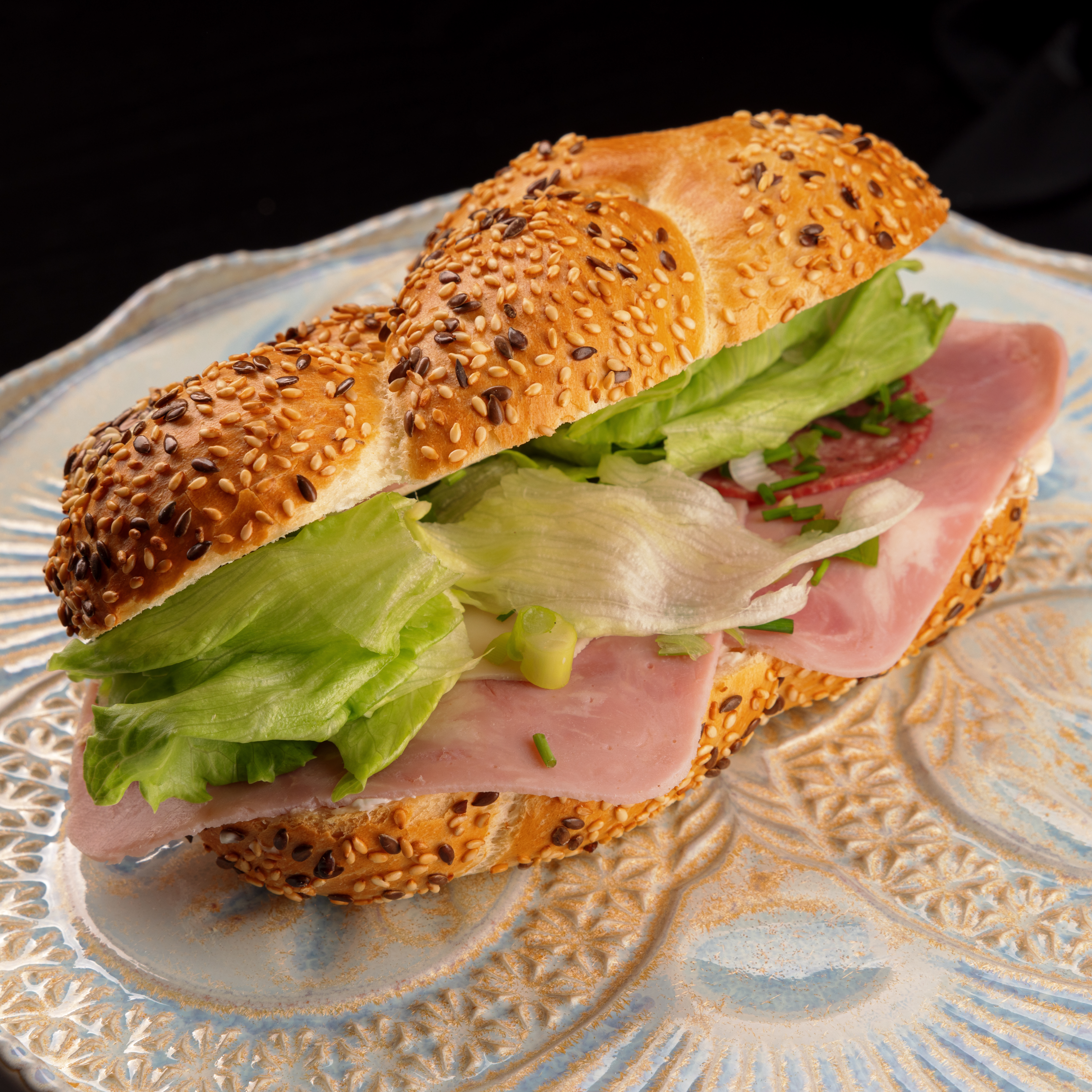 pažitková dobrůtka (pomazánkové máslo /zakysaná smetana, sušené mléko, sušená syrovátka, bramborový škrob, jedlá sůl/, majonéza/rostlinný olej, pitná voda, pasterované vaječné žloutky, cukr, jedlá sůl, kvasný ocet, hořčičné semeno, koření k dochucení, regulátor kyselosti – kyselina citronová, barvivo – beta karoten, riboflavin, stabilizátor – xanthan gum, konzervant – kyselina sorbová, antioxidant E385, obsahuje vejce, soju, celer, hořčici/, pažitka, sůl, cukr, česnek, citronová šťáva, olivový olej), výběrová šunka, vysočina, eidam (mléko, jedlá sůl, sýrařské kultury), jarní cibulka, pažitka. Skladovat od +1°C + 5 °C